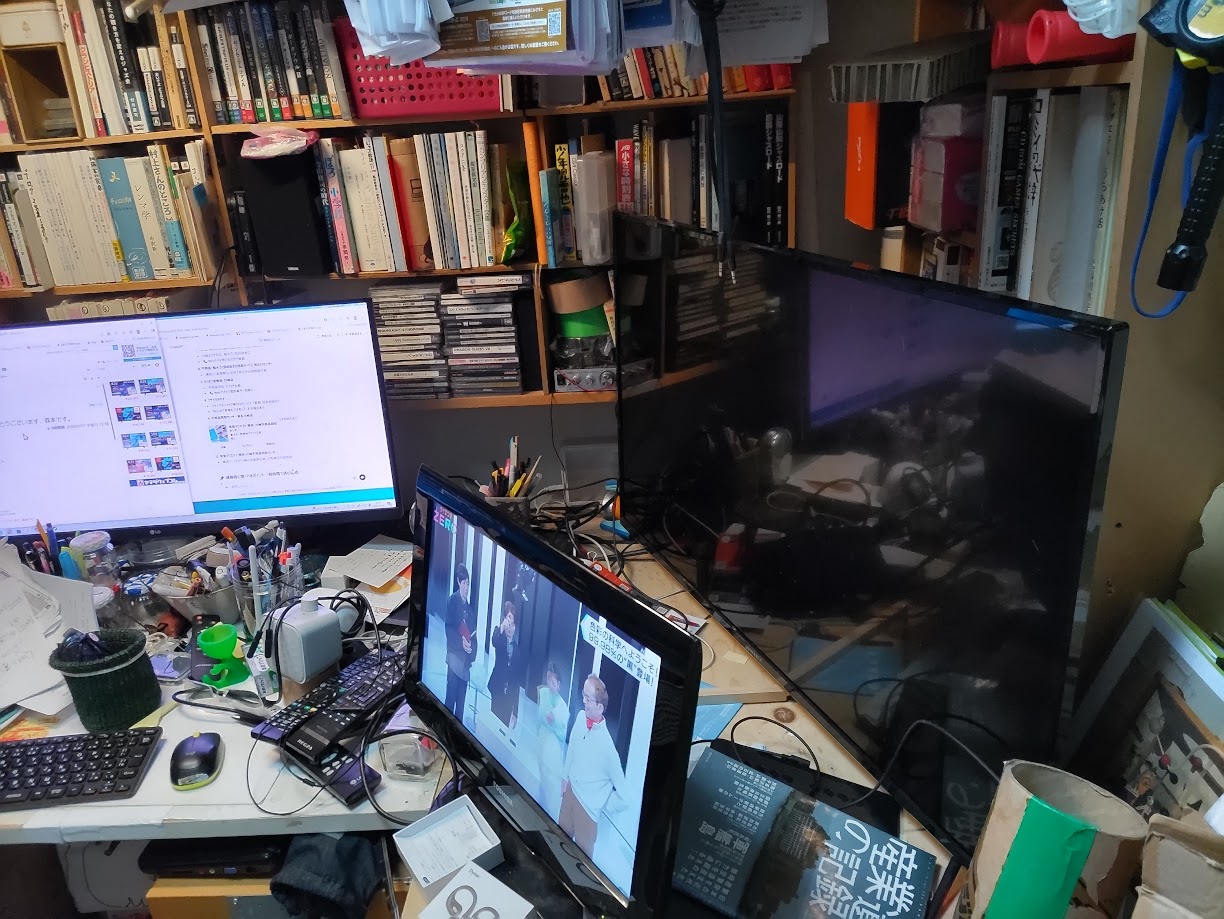 右の大きなものが故障のモニター(43インチ、写っているのは周りの反射)左手にあるのがメインのモニターで超ワイドのモニター、手前のが急遽取り出した旧式なTV(十分役に立つ)。