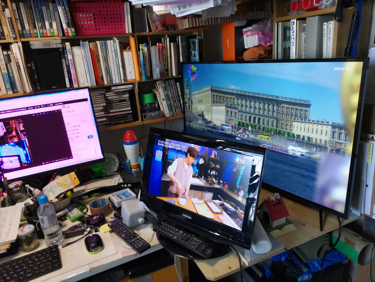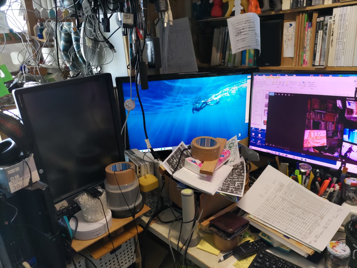 今は、机上にある5台のモニター類のレイアウトをどうするか思案中です。