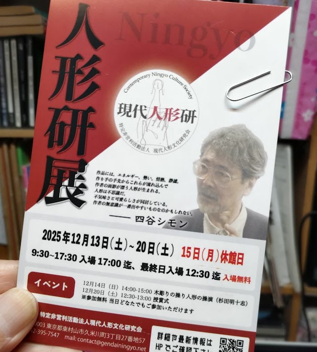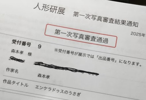 今日(11月12日)は(個人的には紆余曲折あった)大腸がんカメラ健診問題(かかりつけ医者と喧嘩別れ)に一応の決着(ポリープ4個切り)が付き(ぼくにとっては大安心です)、川崎駅近辺から帰ってくると、一通の封筒、『現代人形研展』から、さて、第1次審査は落選か、合格か、(落選なら、応募金の、1万2千円が返ってくる)・・・で、嬉しい事に、第1次通過しました。(このブログ2025年9月8日ご参照)