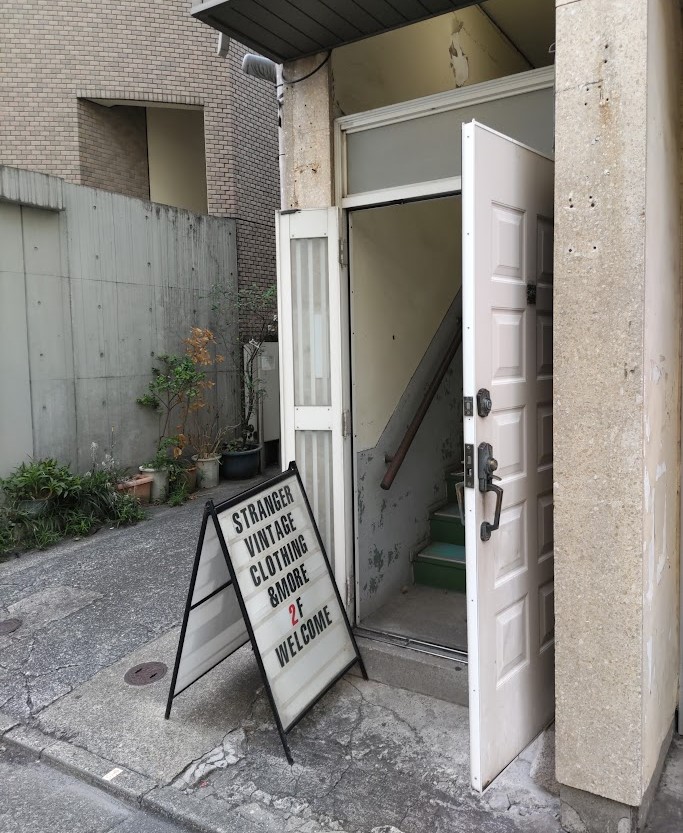 そろそろ商店が切れる辺りにあった。ちょっと古めかしいアパートの2Fにある。『Stranger』Vintage Clothing &More とあります。どうしようか、躊躇しました。