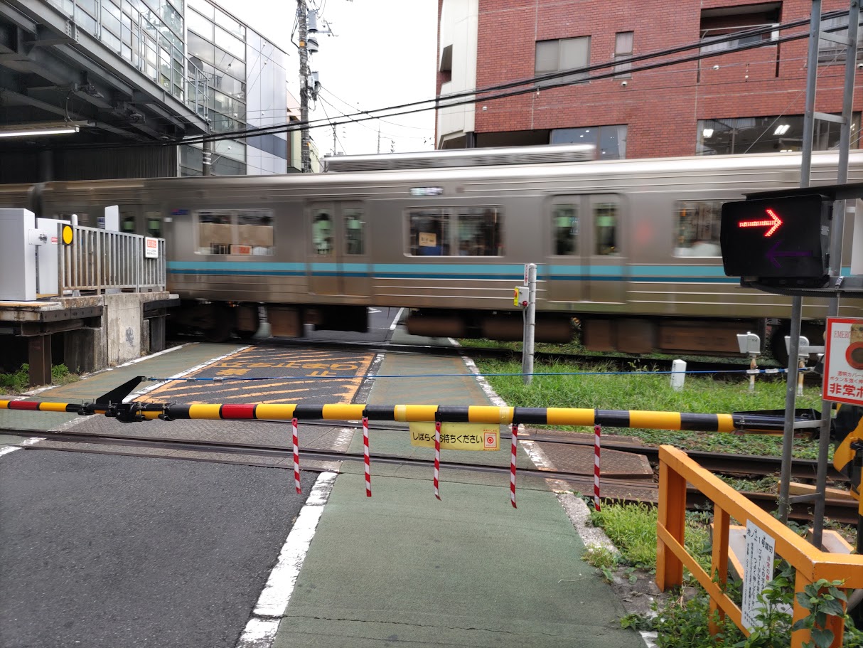 池ノ上のメイン通りを電車が横切る、直ぐ左が駅。
